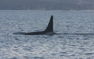 We left Victoria harbour and headed south towards Race Rocks Ecological reserve and then west in the Strait of Juan De Fuca. It ended up being quite the search and we travelled mid-strait as far west as Sheringham Point on Vancouver Island. The conditions were good for spotting but we still had a bit of a tricky time finding the animals especially as it was over 2 hours since they were last seen from the Victoria waterfront. At one point in the trip I thought I saw a male dorsal fin going down but doubted myself because there were so many logs and other debris in the water. Shortly after we turned around in the strait to head back to the east Mark spotted blows to the south of us and they were roughly in the area where I thought I saw a male's dorsal fin.